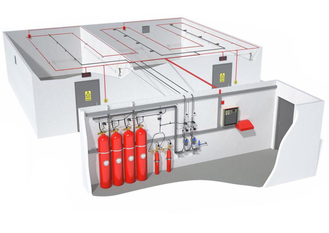 - Монтаж газового пожаротушения выполняется в изолированных помещениях. Негорючие газы опасны для человека, поэтому система активируется только при отсутствии персонала. Также по правилам безопасности монтаж установки газового пожаротушения совмещается с внедрением пожарной сигнализации. Она предупредит персонал о необходимости очистить помещение, чтобы система могла подать газ.